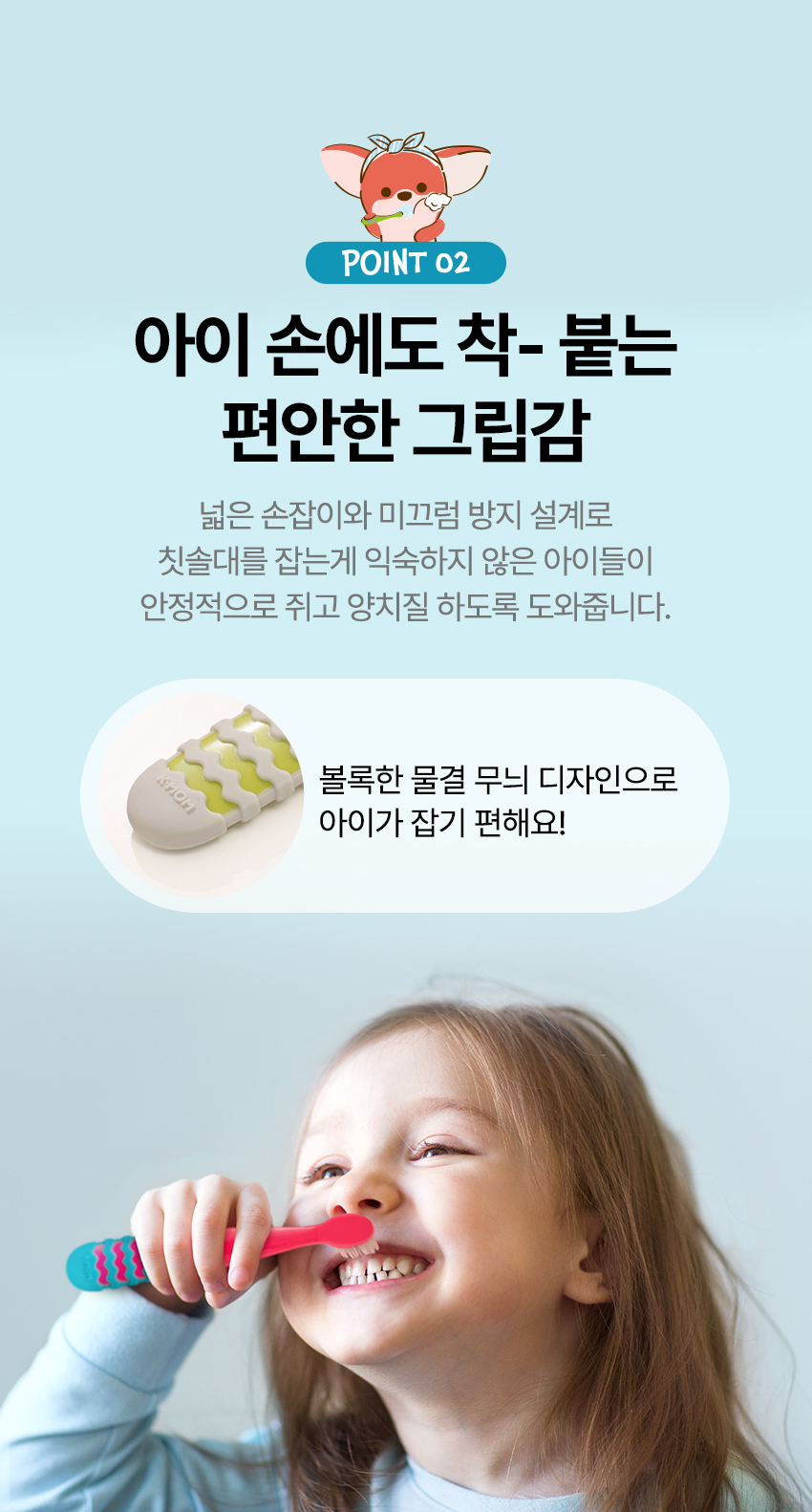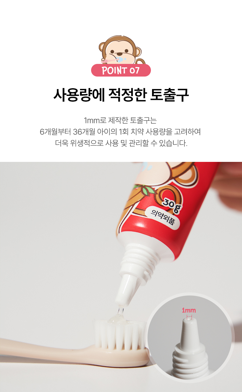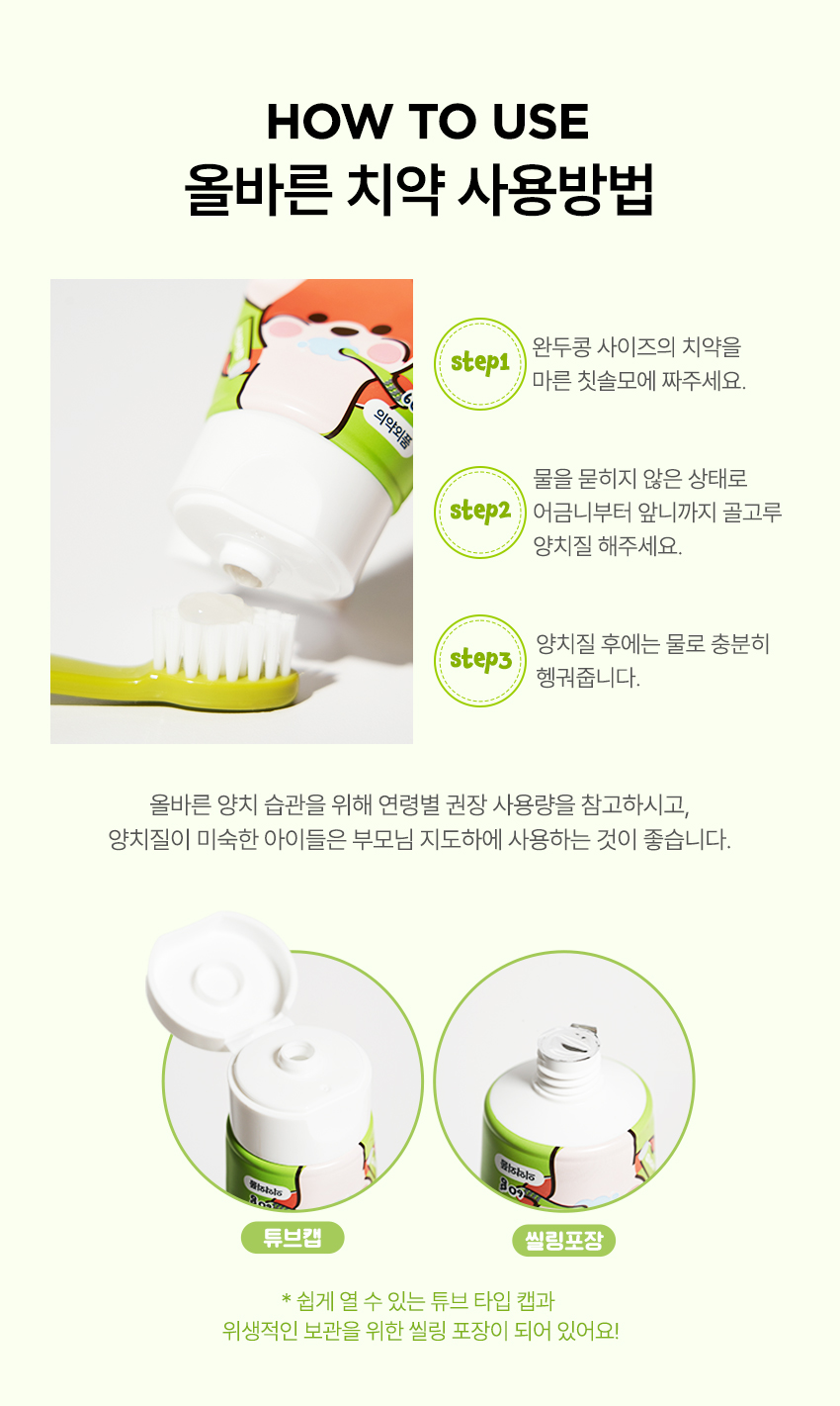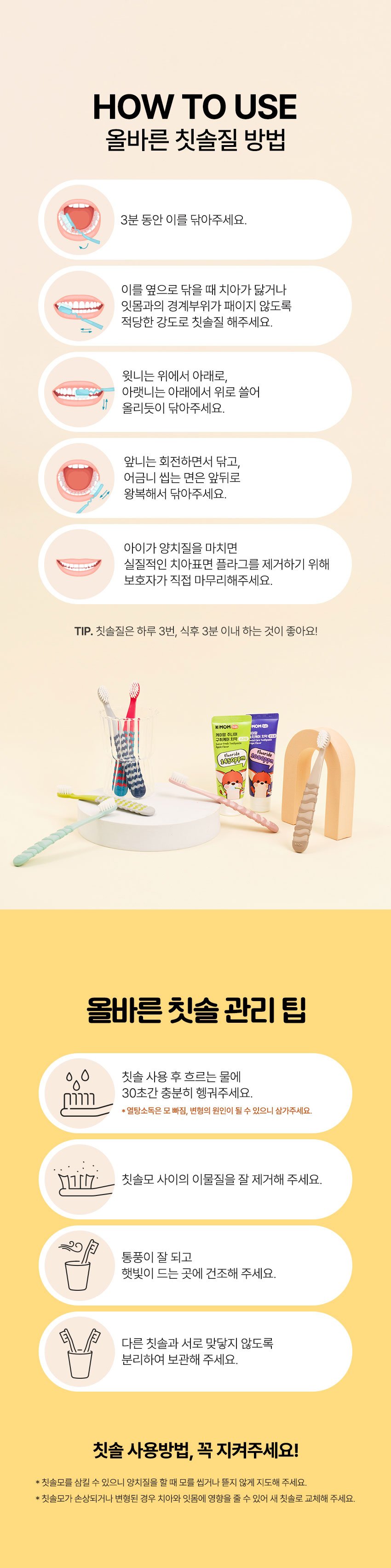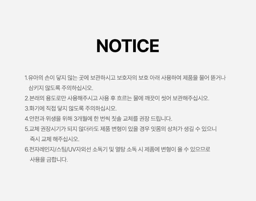 | 취급방법 및 주의사항 | 1.유아의 손이 닿지 않는 곳에 보관하시고 보호자의 보호 아래 사용하여 제품을 물어 뜯거나 삼키지 않도록 주의하십시오.,2.본래의 용도로만 사용해주시고 사용 후 흐르는 물에 깨끗이 씻어 보관해주십시오.,3.화기에 직접 닿지 않도록 주의하십시오.,4.안전과 위생을 위해 3개월에 한 번씩 칫솔 교체를 권장 드립니다.,5.교체 권장시기가 되지 않더라도 제품 변형이 있을 경우 잇몸의 상처가 생길 수 있으니 즉시 교체 해주십시오.,6.전자레인지/스팀/UV자외선 소독기 및 열탕 소독 시 제품에 변형이 올 수 있으므로 사용을 금합니다. |