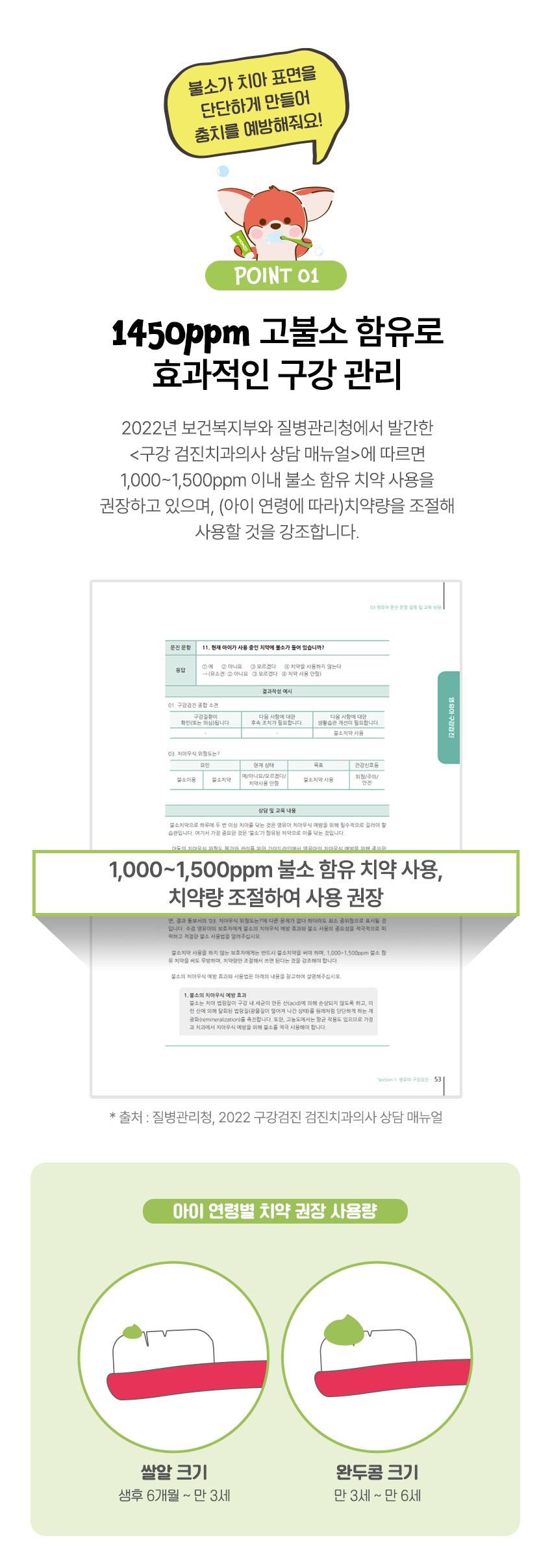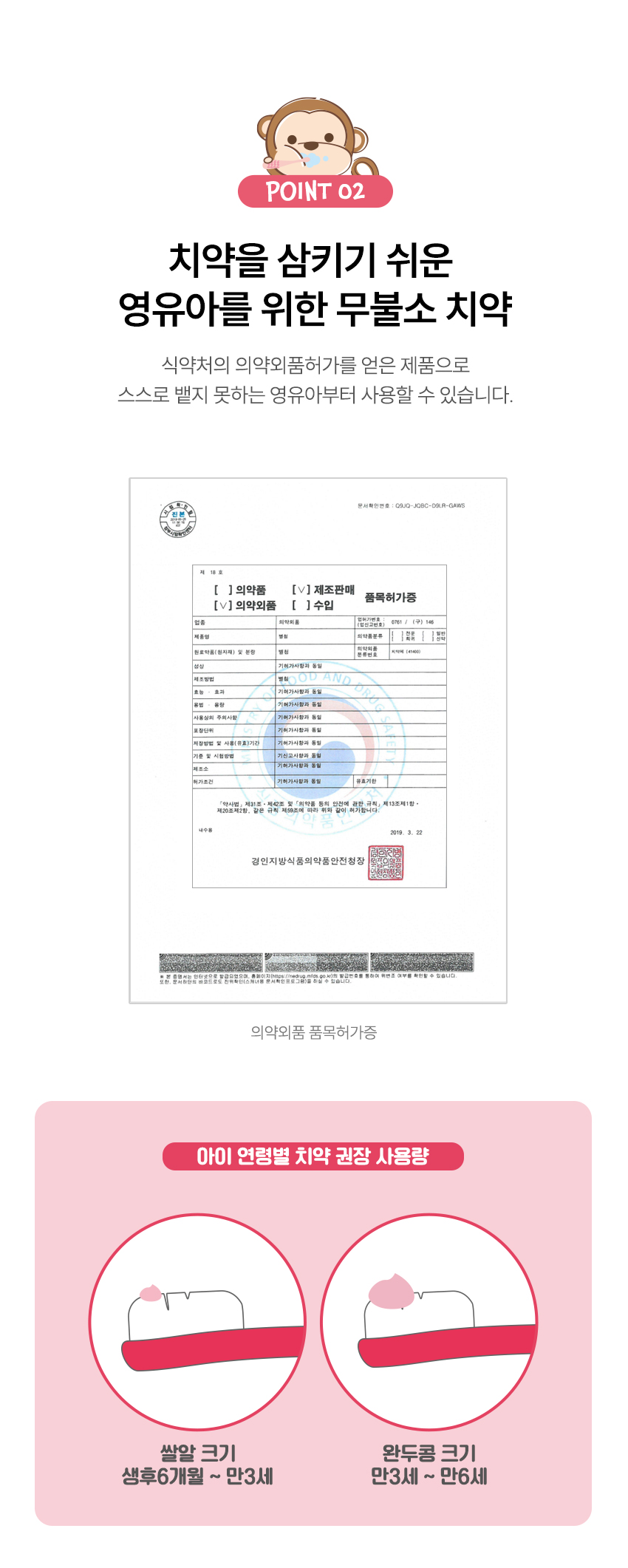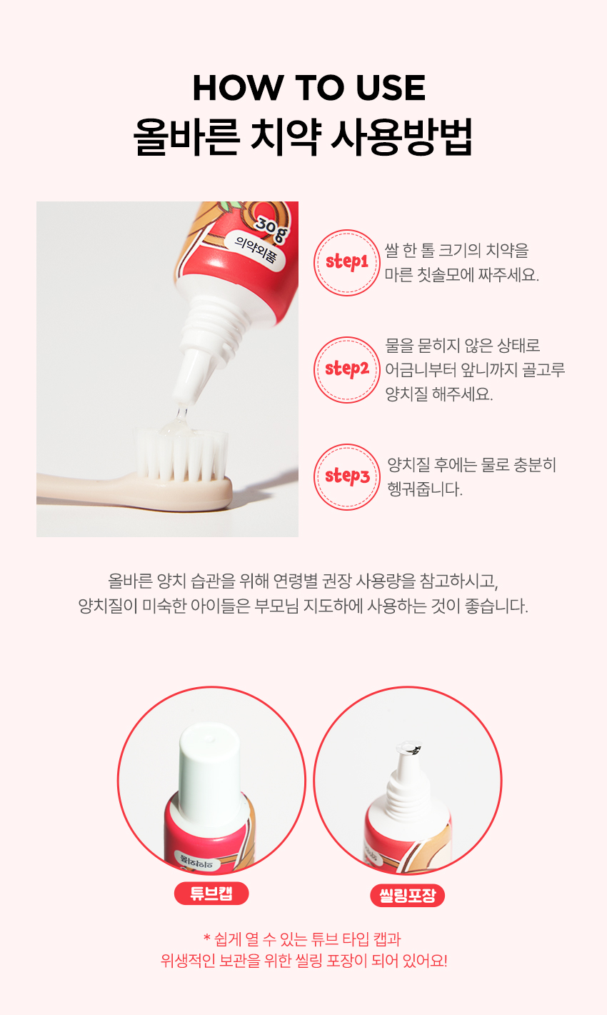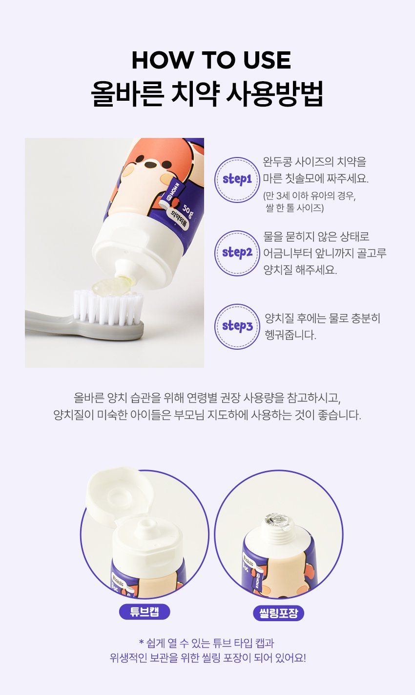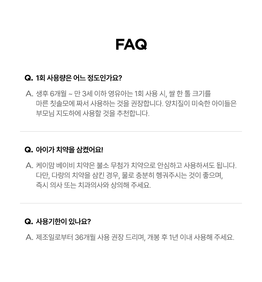 | 취급방법 및 주의사항 | 1.유아의 손이 닿지 않는 곳에 보관하시고 보호자의 보호 아래 사용하여 제품을 물어 뜯거나 삼키지 않도록 주의하십시오.,2.본래의 용도로만 사용해주시고 사용 후 흐르는 물에 깨끗이 씻어 보관해주십시오.,3.화기에 직접 닿지 않도록 주의하십시오.,4.안전과 위생을 위해 3개월에 한 번씩 칫솔 교체를 권장 드립니다.,5.교체 권장시기가 되지 않더라도 제품 변형이 있을 경우 잇몸의 상처가 생길 수 있으니 즉시 교체 해주십시오.,6.전자레인지/스팀/UV자외선 소독기 및 열탕 소독 시 제품에 변형이 올 수 있으므로 사용을 금합니다. |