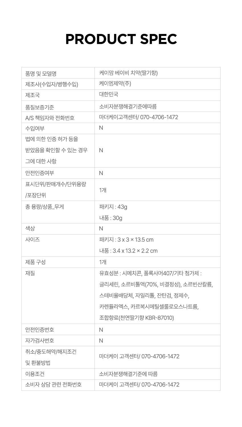 | 용량(중량), 수량, 크기 | 중량,패키지 : 213g ,내품 : 12g,,크기,패키지 : 45 x 21.9 x 2 cm,내품 : 2.2 × 15.3 × 1.4 cm |