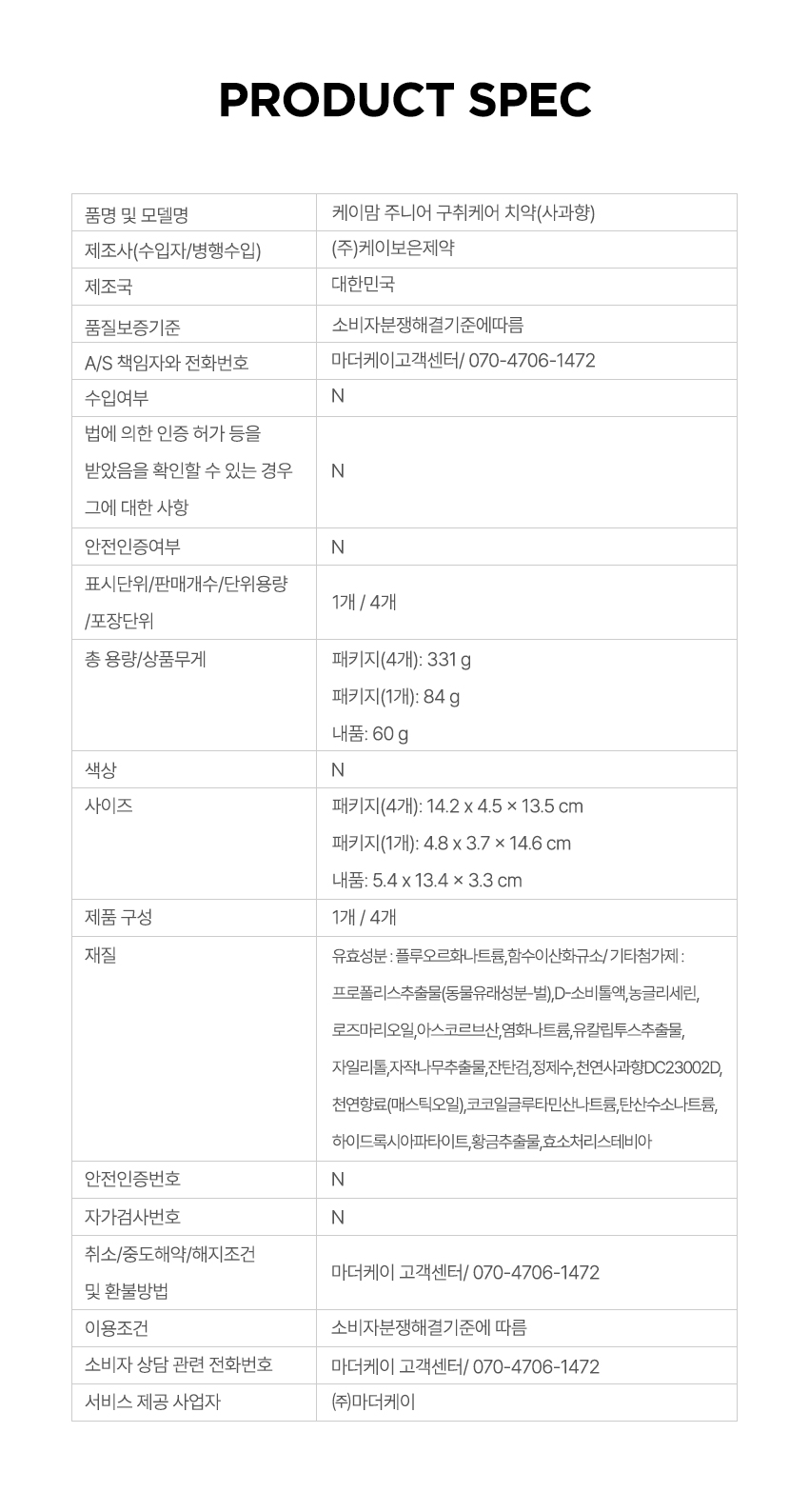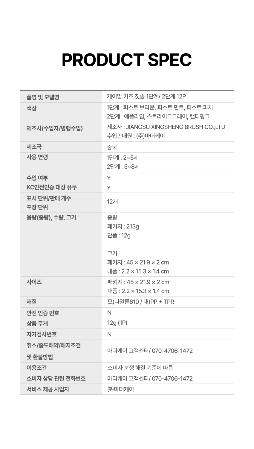 | 품명 및 모델명 | 케이맘 키즈 칫솔 1단계 12P |